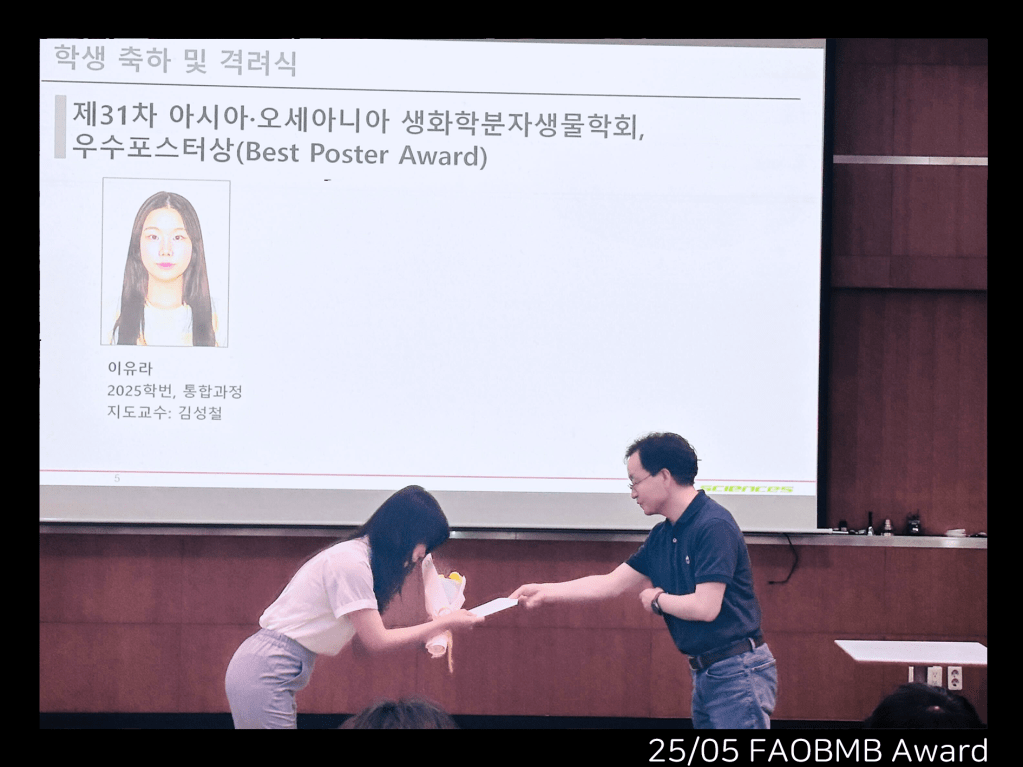 지난 FAOBMB에서 이유라 학생이 Best Poster Award를 수상하였습니다. 학과에서도 학생 축하 및 격려식을 진행하여 이유라 학생의 수상을 축하하고, 격려해주셨습니다.