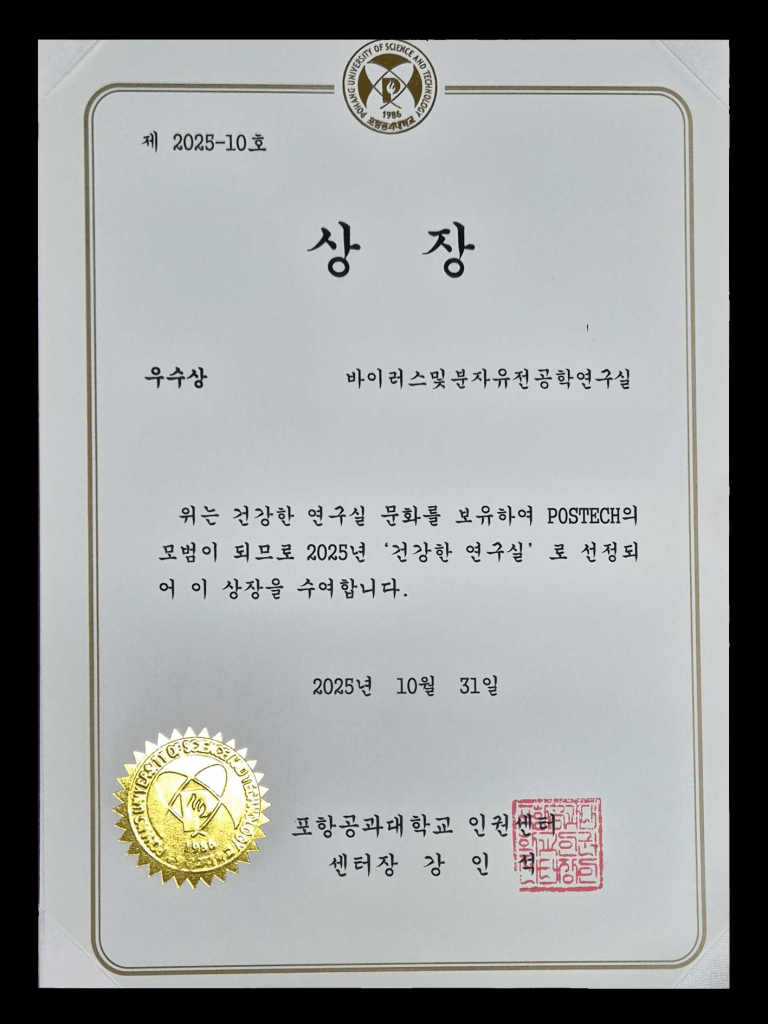 지난 2025년 10월, VMGE 연구실이 2025년 ‘건강한 연구실’로 선정되었습니다! 올해는 136개 연구실 중 4등에 선정되어 ‘우수상’을 수상하였으며, 앞으로도 바람직한 연구실 문화를 잘 만들어나가고, 유지할 수 있도록 노력하겠습니다.