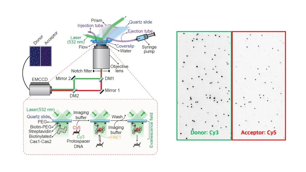 Our group has extensive expertise in the single-molecule fluorescent imaging technique, which has revolutionized the way we observe and understand molecular interactions at a fundamental level. Single-molecule FRET (Förster Resonance Energy Transfer) is a sophisticated biophysical technique that is predominantly utilized to measure distances at several nanometer scales within a single molecule, allowing researchers to gain insights into molecular dynamics that were previously difficult to achieve. This remarkable property can be mainly employed as a highly precise molecular ruler or to elucidate the dynamic molecular structures and intricate interactions that govern biological processes. The main advantage of using TIRF (Total Internal Reflection Fluorescence) microscopy lies in its exceptional spatio-temporal resolution, which is significantly higher compared to traditional epifluorescent microscopy, as it visualizes only surface-immobilized molecules and minimizes the background fluorescence from the bulk solution. By carefully utilizing the photophysical properties associated with photobleaching phenomena, in conjunction with FRET techniques, we can comprehensively study diverse aspects of molecular interactions, including molecular stoichiometry, transient binding events, and the co-localization of proteins and nucleic acids, thus providing deeper insights into the mechanisms underlying cellular functions and interactions. This methodology serves as a powerful tool in the field of molecular biology, facilitating significant advancements in our understanding of complex biological systems.